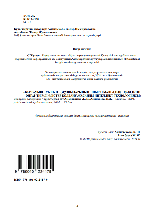 Амандыкова Жанар Шемирхановна , Асыкбаева Жанар Жумахановна 18-04-2025, 11:59 Пікір: 0 Үздік авторлық жұмыстар