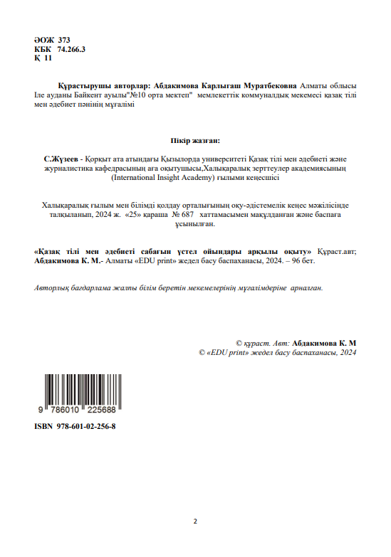 Абдакимова Карлыгаш Муратбековна «ҚАЗАҚ ТІЛІ МЕН ӘДЕБИЕТІ САБАҒЫН ҮСТЕЛ ОЙЫНДАРЫ АРҚЫЛЫ ОҚЫТУ» Авторлық бағдарлама