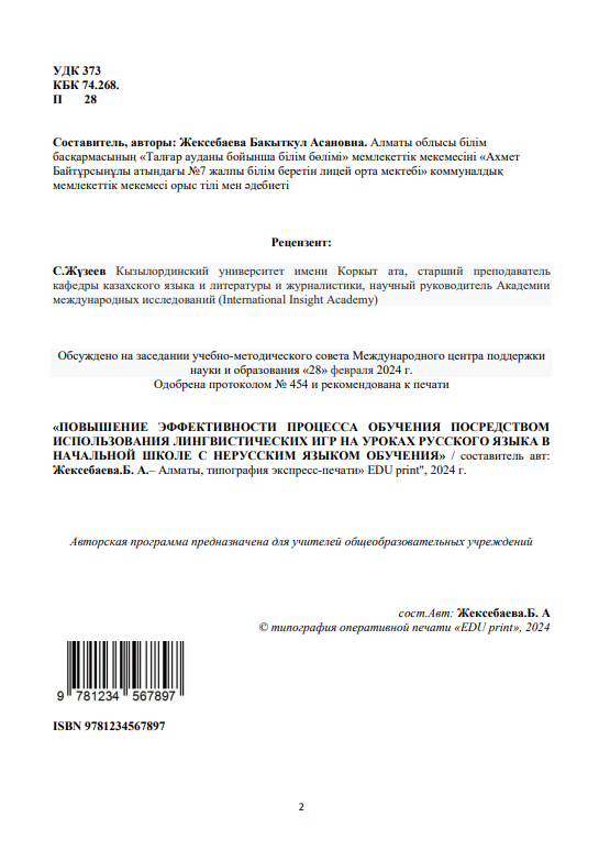 Жексебаева Бакыткул Асановна «ПОВЫШЕНИЕ ЭФФЕКТИВНОСТИ ПРОЦЕССА ОБУЧЕНИЯ ПОСРЕДСТВОМ ИСПОЛЬЗОВАНИЯ ЛИНГВИСТИЧЕСКИХ ИГР НА УРОКАХ РУССКОГО ЯЗЫКА В НАЧАЛЬНОЙ ШКОЛЕ С НЕРУССКИМ ЯЗЫКОМ ОБУЧЕНИЯ» Авторская программа