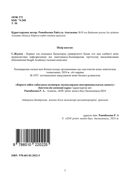 Раимбекова Райгуль Акатаевна ҰЛТТЫҚ СӘНДІК-ҚОЛДАНБАЛЫ ӨНЕР АРҚЫЛЫ МЕКТЕП ОҚУШЫЛАРЫНЫҢ КӘСІБИ ШЕБЕРЛІГІН ҚАЛЫПТАСТЫРУ