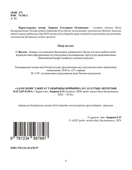 Заирова Ельмирам Османовна АДАМ ЖӘНЕ ТАБИҒАТ ТАҚЫРЫБЫ БОЙЫНША 34 САҒАТТЫҚ АВТОРЛЫҚ БАҒДАРЛАМА Авторлық бағдарлама