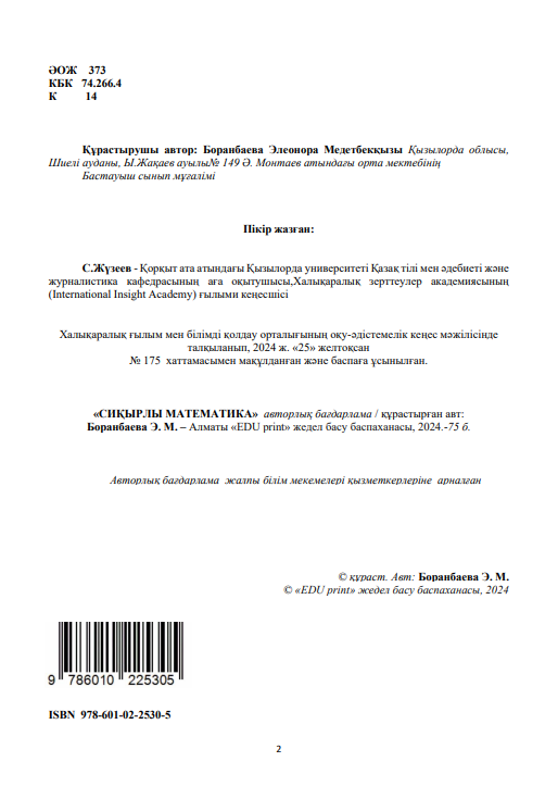 Боранбаева Элеонора Медетбекқызы СИҚЫРЛЫ МАТЕМАТИКА Авторлық бағдарлама 28-02-2025, 14:32 Пікір: 0 Үздік авторлық жұмыстар